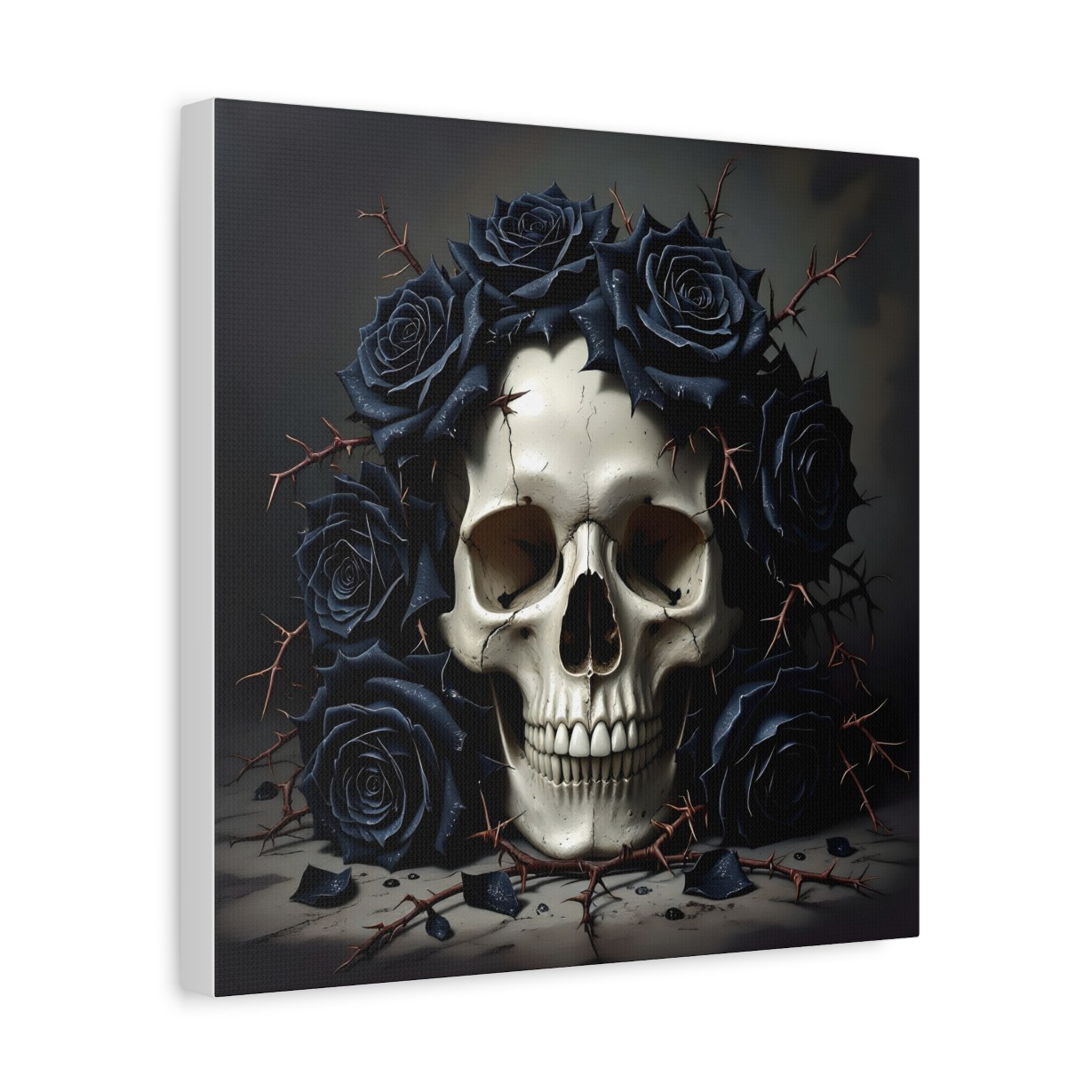 Creepy wall art featuring a human skull covered in thorns and black roses, perfect for horror lovers and Halloween enthusiasts. This eerie design will add a spooky touch to any room decor, making it ideal for Halloween or horror-themed celebrations. The matte finish and stretched canvas give a high-quality look to the artwork.