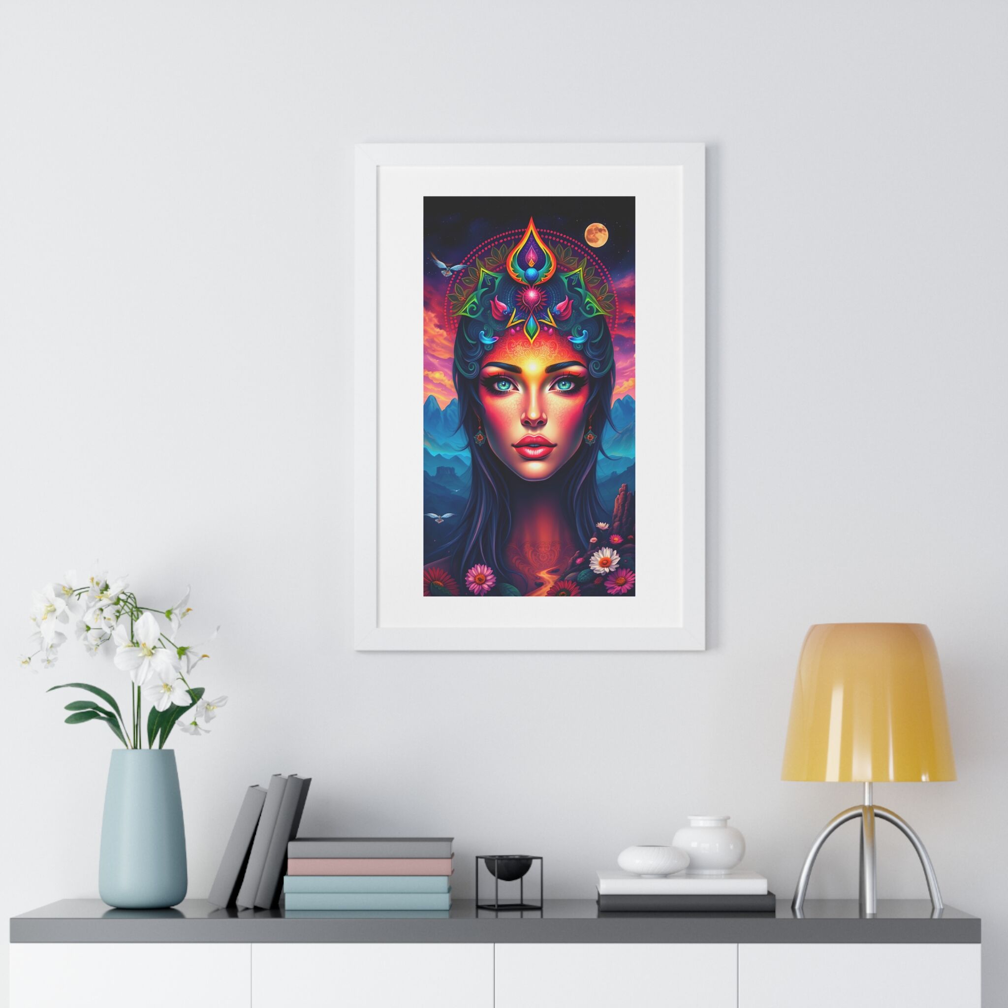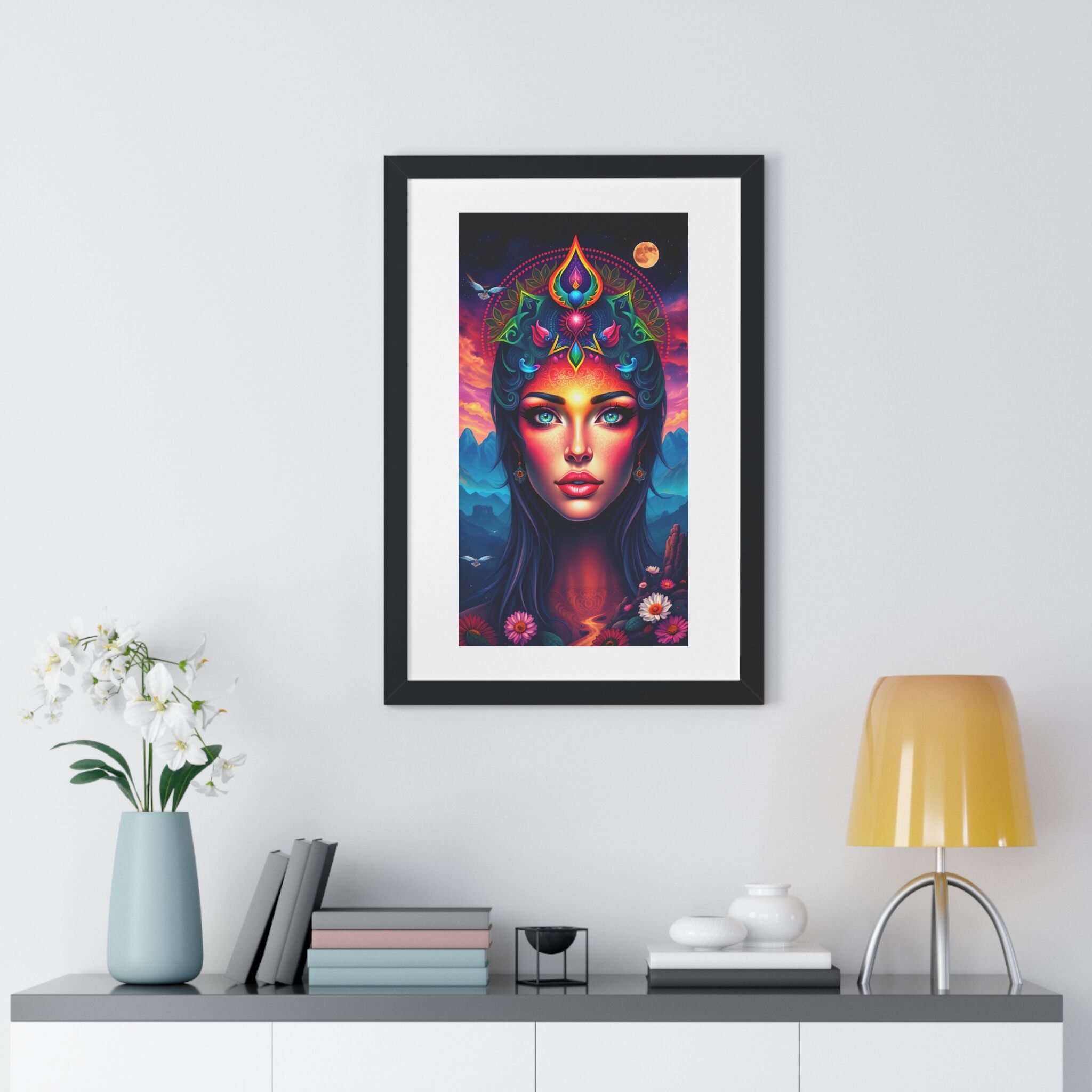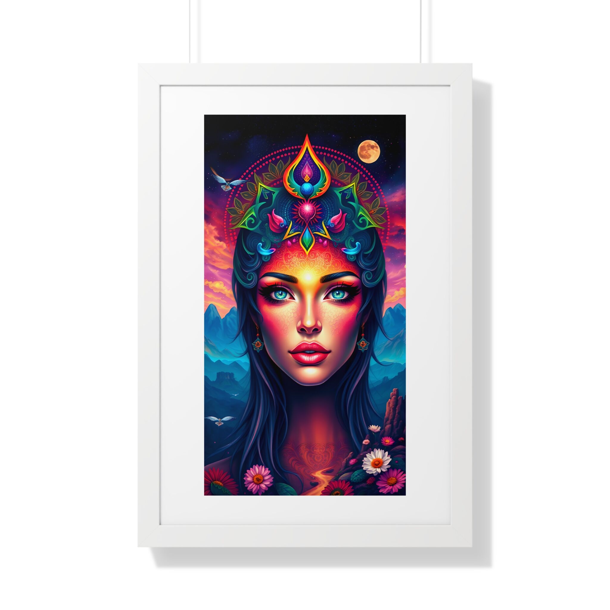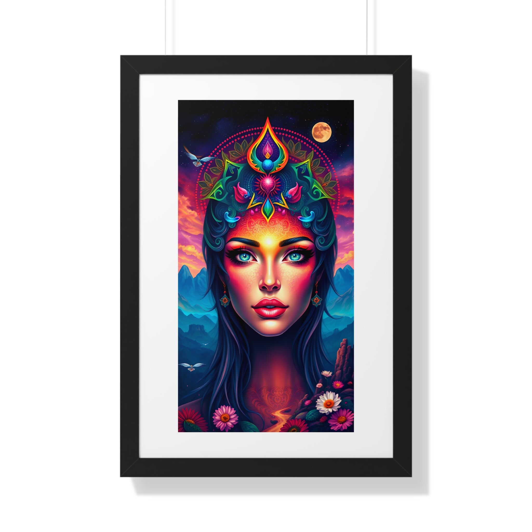Invite the beautiful goddess of the mountains into your space. The mesmerizing face with beautiful haunting eyes against a backdrop of serene mountain scenery gives off a peaceful and mystical vibe. This framed art is perfect for nature lovers, spiritual individuals, and those who appreciate beautiful art. Ideal for home decor, meditation spaces, or as a gift for a friend who loves mountain landscapes.